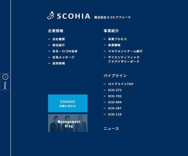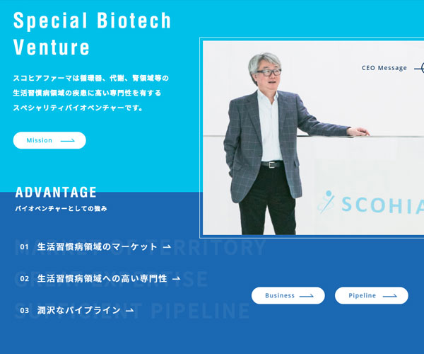 Scohia在心血管、代謝、腎臟方面有著高專注度的生物企業,網站以不同的藍色基調,